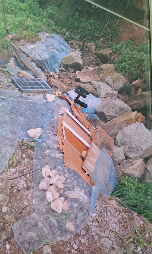 현재는 비닐과 나무조각, 무거운 물건 등으로 임시 고정해 놓은 상태이며, 추가 붕괴 위험이 매우 높은 상황입니다.”