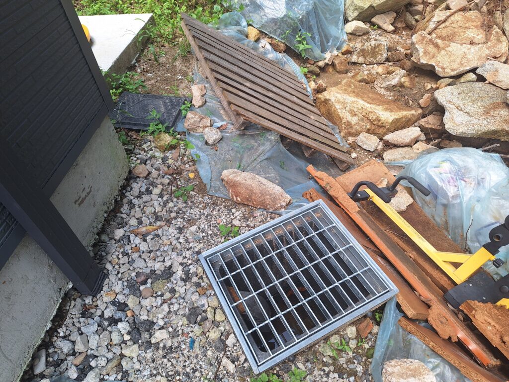 정화조 주변 경계석과 토사는 건물 모서리 약 30cm만 남기고 무너졌고, 오수통 연결부의 하천과 맞닿은 한쪽면 토사는 완전히 유실되었습니다.